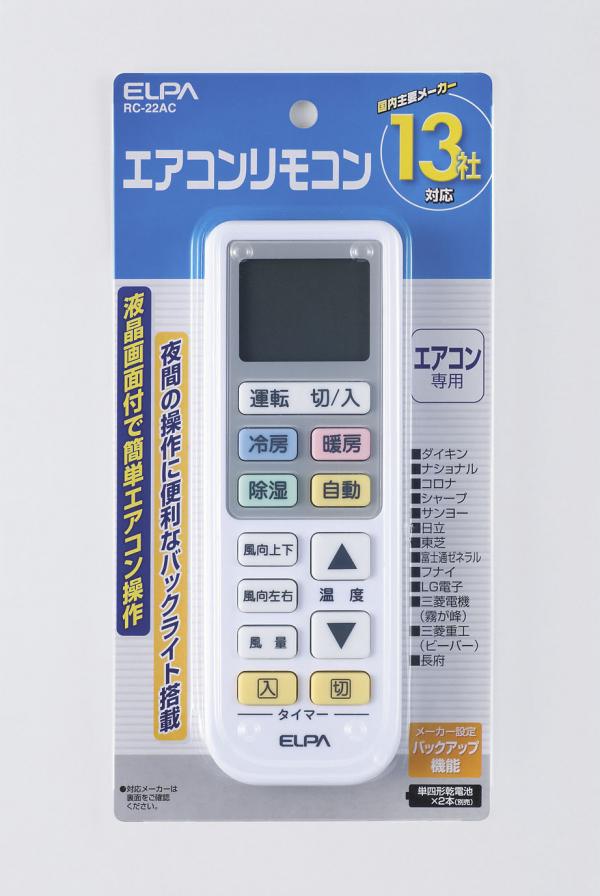 「リモコンがなくなってしまった」、「純正のリモコンは値段が高い」など、困ったときにおすすめのリモコン!液晶画面付で簡単エアコン操作タイマー設定機能付夜間の操作に便利なバックライト付液晶画面サイズ16×5.6×2.3cm個装サイズ:11×21.5×2.5cm重量95g個装重量:130g素材・材質ABS、ラバー付属品取扱説明書、保証書(保証期間1年)製造国中国国内主要メーカー13社対応 動作距離:約7m、電源:DC3V 単四形乾電池×2本、電池持続期間:約12ヶ月(アルカリ乾電池使用時/バックライトOFF時) 「リモコンがなくなってしまった」、「純正のリモコンは値段が高い」など、困ったときにおすすめのリモコン!液晶画面付で簡単エアコン操作タイマー設定機能付夜間の操作に便利なバックライト付液晶画面