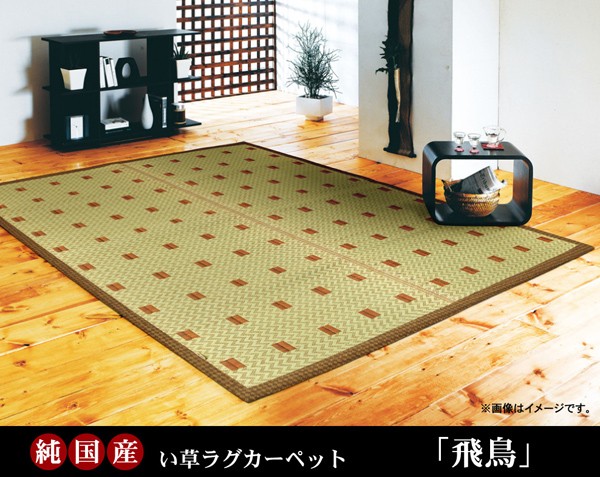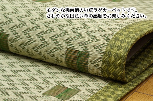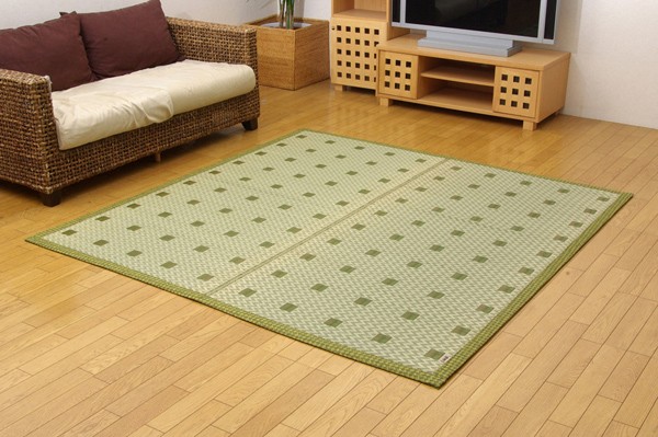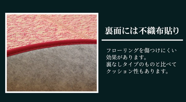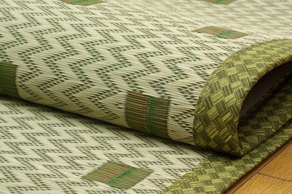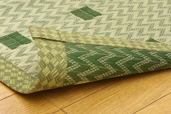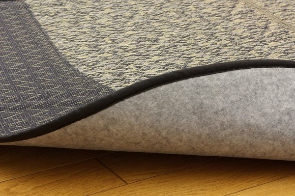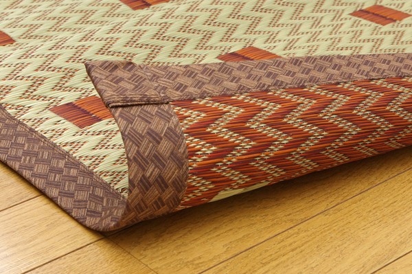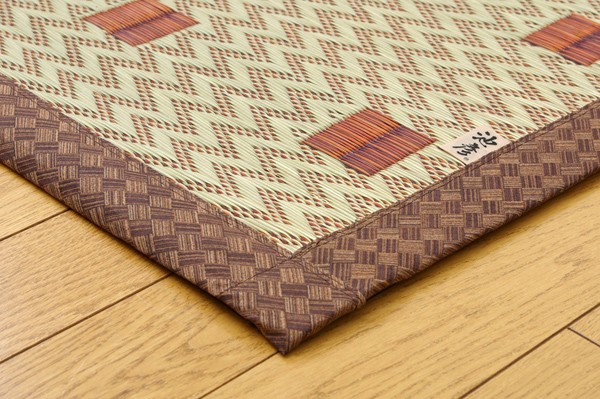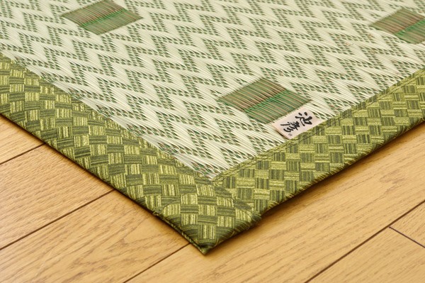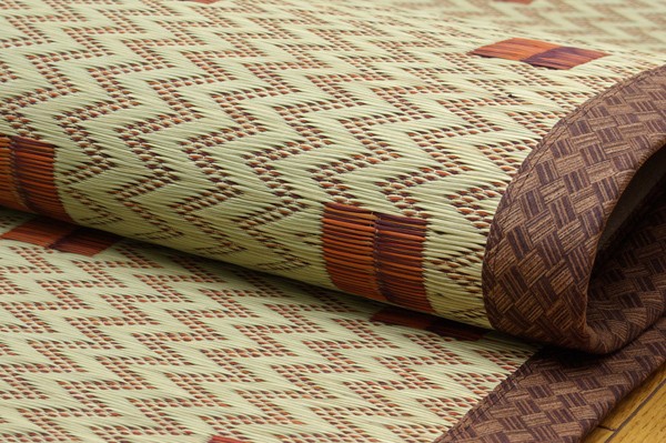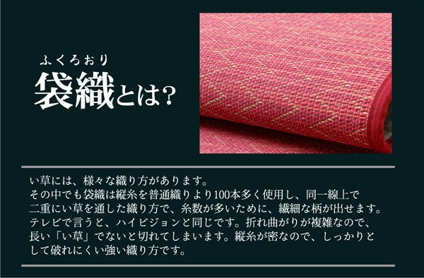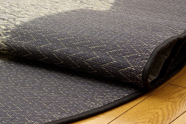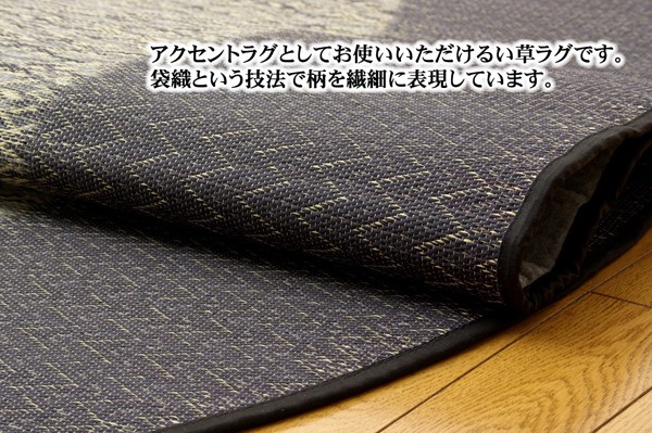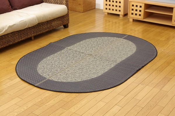 縦糸の本数が多い袋織りという技法で繊細な柄を出しています。折れ曲がりが複雑なので長いイ草を使用しないと切れてしまいます。縦糸が密なので、しっかりとして破れにくいのが特徴です。楕円形でアクセントラグとしてもお使いいただけます。国産(九州産)のい草を使用しています。一本一本が太く、表皮が厚く繊維がキメ細かいので弾力性があり、耐久性に優れています。い草には空気の自然浄化作用、湿度の調節作用などがあります。また汚れにくく、使用するうちに黄金色に変化し味が出ます。い草に青森ヒバ加工を施しています。(抗菌、防臭効果)