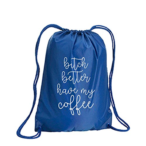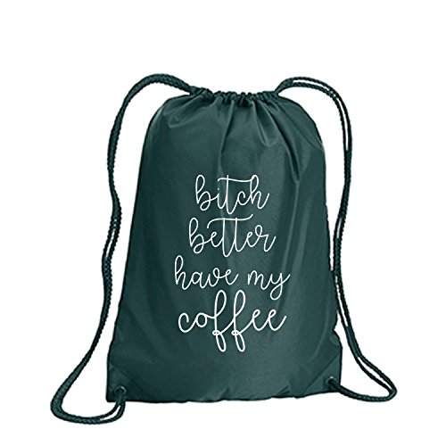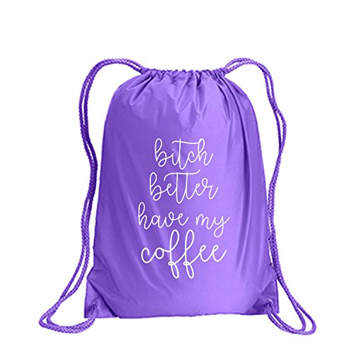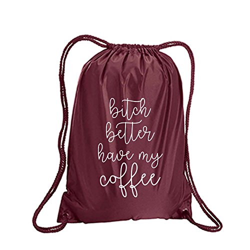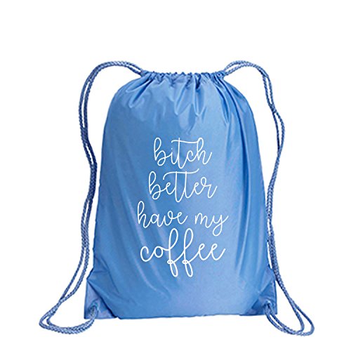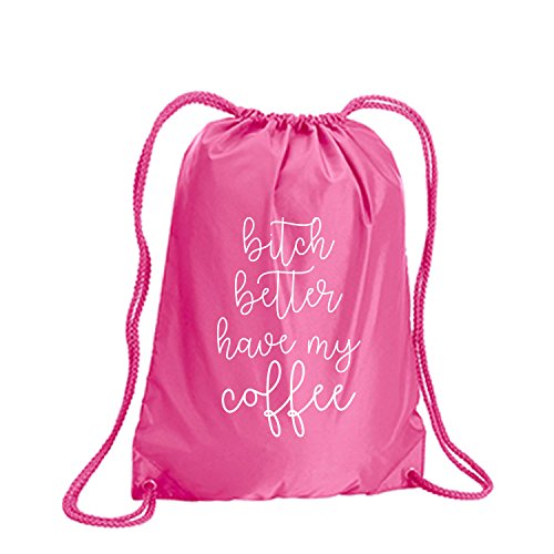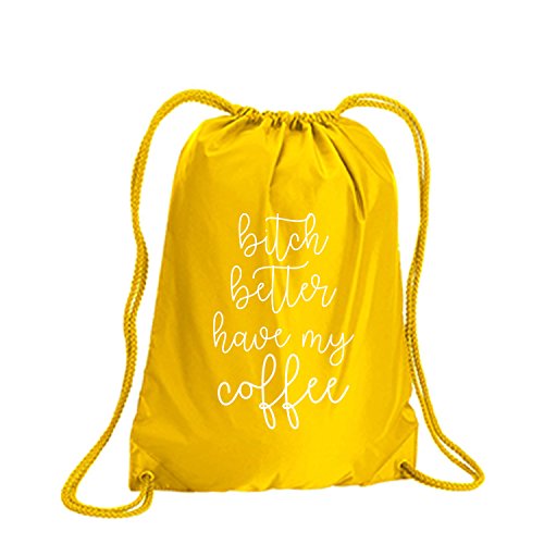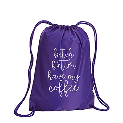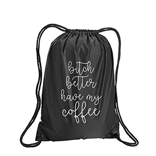 Product Description This durable and stylish nylon tote features "bitch better have my coffee" on a cinch pack tote with white ink. Bag comes in small and large sizes and is made of a durable 210 Denier nylon and has color-matched draw cords. Printed in the USA on an imported bag. 0