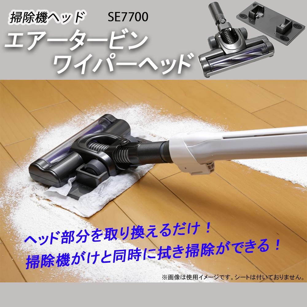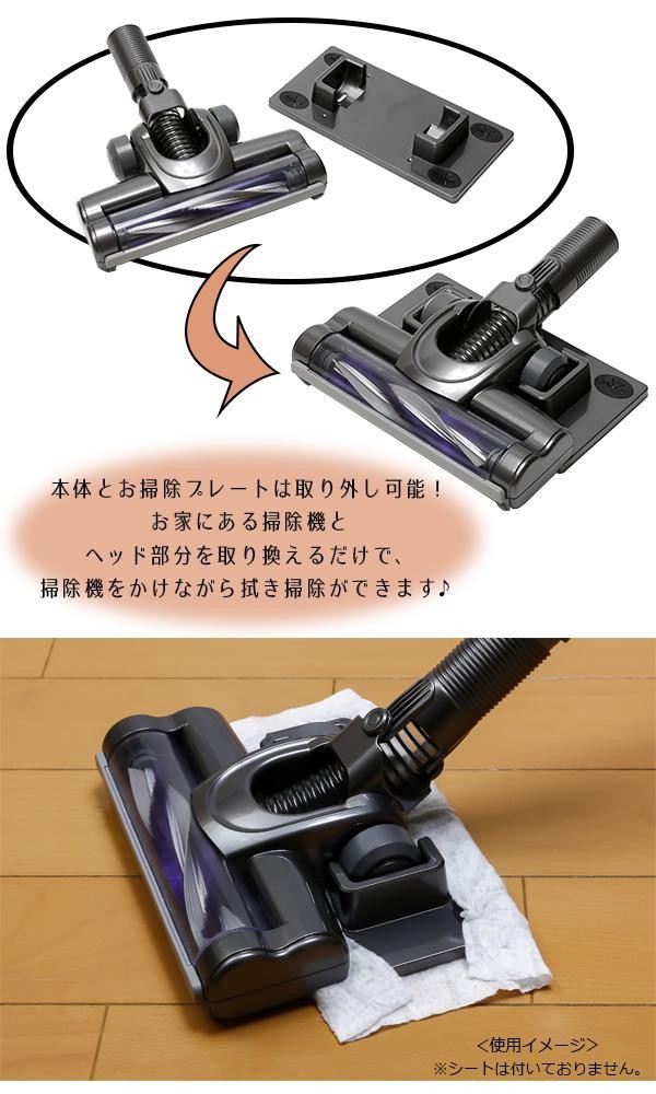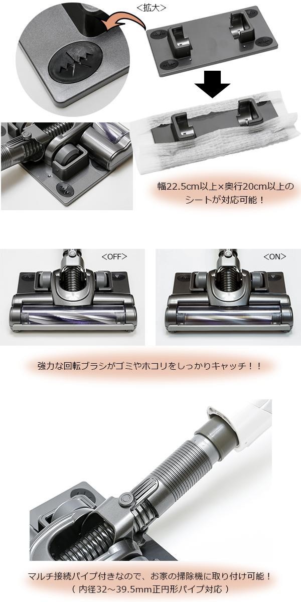 掃除機をかけながら、同時に拭き掃除が可能です。強力な回転ブラシがゴミやホコリをキャッチ!!お掃除プレートは取り外し可能で、タービンヘッド単体でも使用できます。お掃除シートは、幅22.5cm以上×奥行20cm以上のシートであれば対応可能。専用のアタッチメント(マルチ接続パイプ)は、内径32~39.5mmの丸型パイプを使用している掃除機に対応しています。 |
