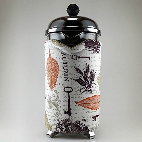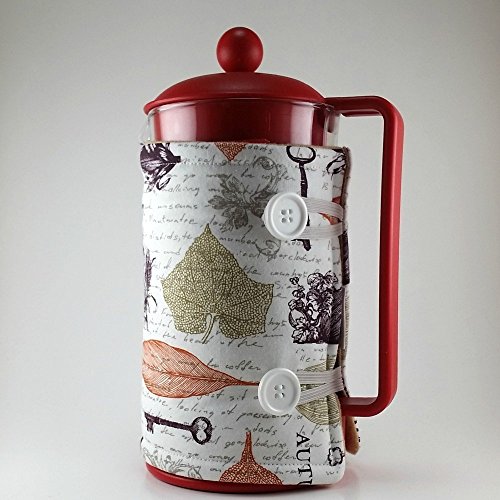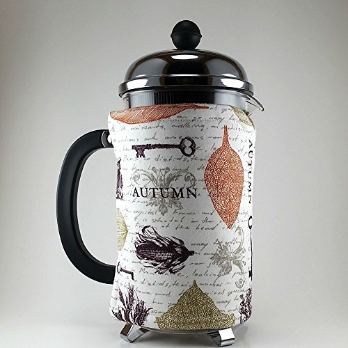 Product Description With fall here, what better way to bring a little autumn decor into your home than by sprucing up your french press? This is a handmade french press cozy, made to fit an 8 cup press. Made with 100% cotton print, insulated with Insul-Bright and lined with cozy cotton flannel fabric. Two 1/4 inch straps loop easily over two buttons for an easy placement. Top stitching in a coordinating color for a quality finish. Measures: 12 1/4 x 6 3/4 inches 31 1/2 x 17 cm 0