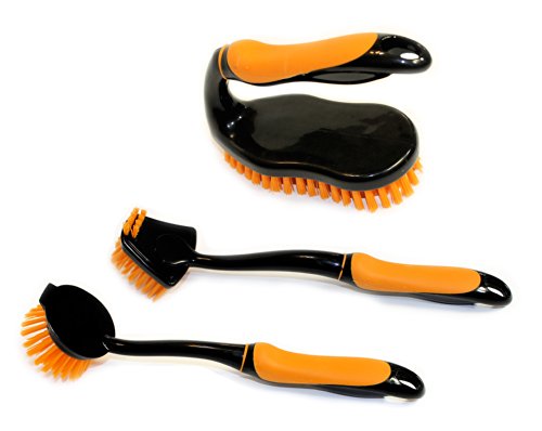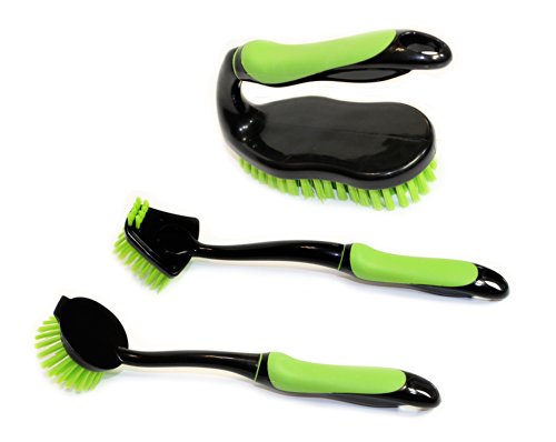 Set of 3 deluxe brushes. Comfort grip handle. Durable bristles. Holes on handles for hanging. Includes: 1 Dish brush (12" long), 1 pan brush(11" long), and 1 scrub brush (6" x 4.2" x 2.5")