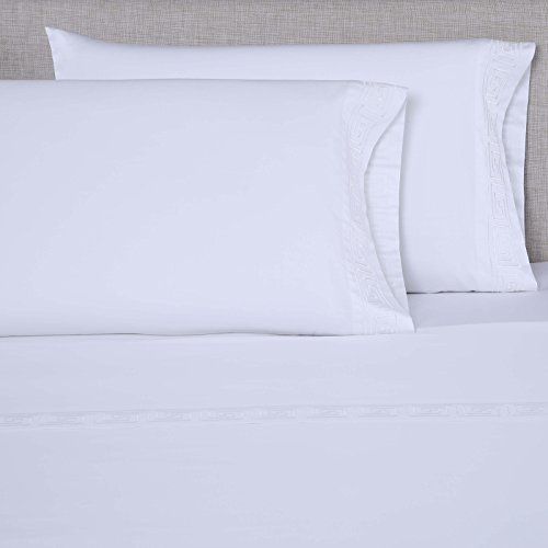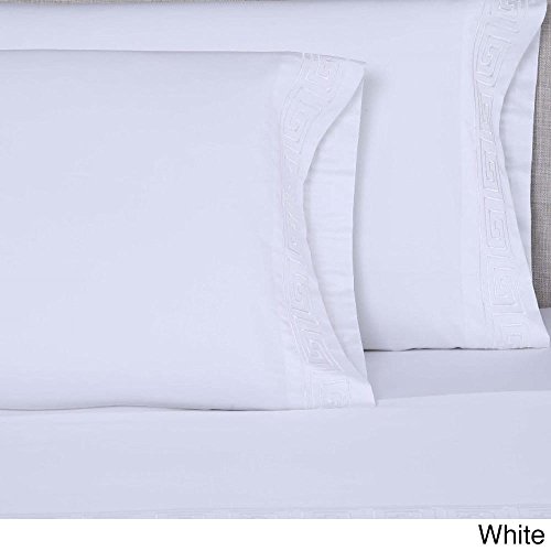 Studio : Affluence Publisher : Affluence Binding : Kitchen Product Description Add luxury and class to your bedroom or guest room with this stunning set of two Affluence Greek Key Embroidered Sheet Set. These sheets feature an elegant Greek Key embroidered hem and 600 thread count cotton construction for a soft, comfortable feel. Includes: One (1) flat sheet, one (1) fitted sheet, two (2) pillowcasesFitted sheet pocket depth: 20 inchesThread count range: 600 - 699 TCType: Luxury, deep pocket, embroideredProduct features: Fully elasticized fitted sheetMaterial: Cotton, Egyptian cottonStyle: Classic, traditional, designerWeave: SateenPattern: Solid color, very solid color, embroideredCare instruction: Machine washSet includes: 4 piecesSize: Full, queen, kingColor: White, off-white Full dimensions: Flat sheet: 85 inches wide x 96 inches longFitted sheet: 54 inches wide x 75 inches long x 15 inches deepStandard pillowcases: 20 inches wide x 32 inches longQueen dimensions:Flat sheet: 92 inches wide x 104 inches longFitted sheet: 60 inches wide x 80 inches long x 15 inches deepStandard pillowcases: 20 inches wide x 32 inches longKing dimensions:Flat sheet: 110 inches wide x 114 inches longFitted sheet: 78 inches wide x 80 inches long x 15 inches deepKing pillowcases: 20 inches wide x 40 inches longThe digital images we display have the most accurate color possible. However, due to differences in computer monitors, we cannot be responsible for variations in color between the actual product and your screen. 0