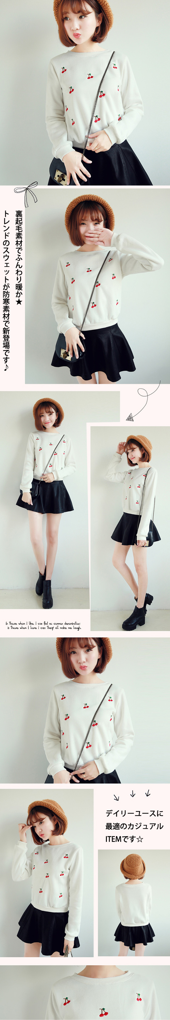 | 裏起毛素材でふんわり暖か★トレンドのスウェットが防寒素材で新登場です?アクセントとなってくれるチェリー刺繍デザインですが、レイヤードもしやすく、着回し力も◎!!ほどよいゆとりのあるシルエットも、長すぎないトップス丈で女性らしさをKEEPしてくれる秘訣です?スカートなどのLadyアイテムに合わせると今季らしい甘辛MIXスタイルが即完成!!デイリーユースに最適のカジュアルITEMです☆ | |