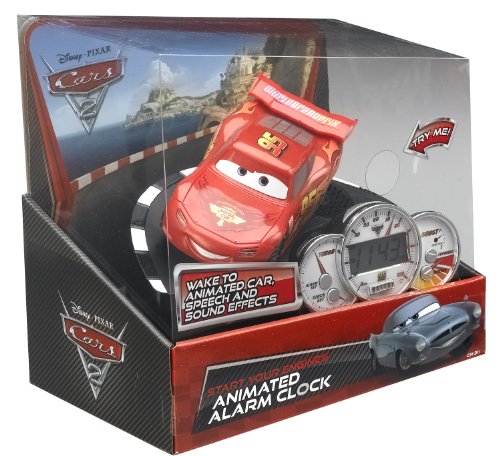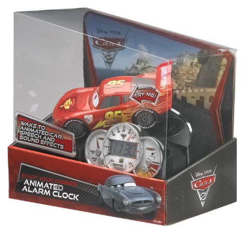 Features. Youll be moving full speed and pedal to the metal when you wake up with this animated alarm clock. Wake up to sound effects and speech from Finn McMissle. The animated movement will surely wake you with a smile at the first sound of the alarm. LCD clock display. Wake to speech and sound effects or buzzer. Finn revs and moves when the alarm sounds. Easy to set clock and alarm controls with snooze. Battery backup. Character - Cars