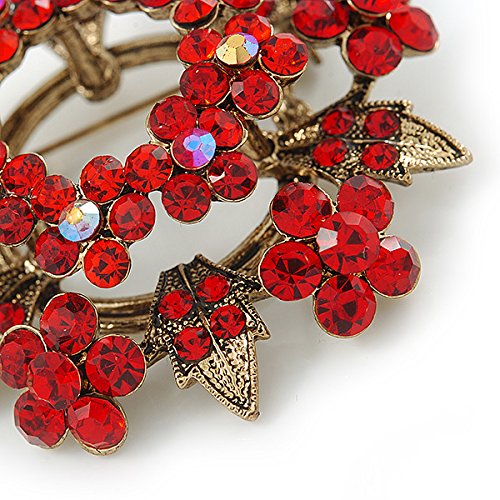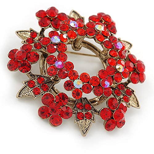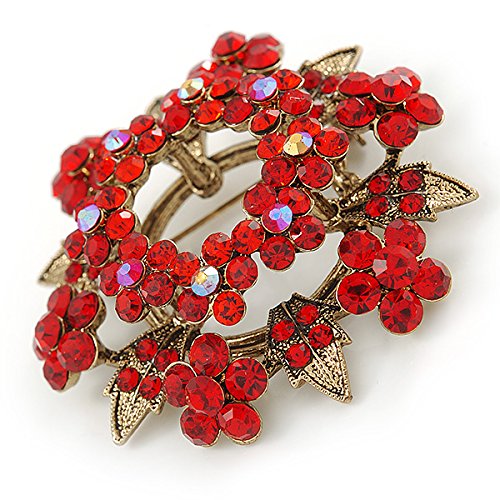 Command admiring glances wherever you go with this stunning Siam Red Crystal Wreath Brooch In Antique Gold Tone Featuring a wreath design, crafted in antique gold tone metal and decorated with siam red crystal flowers. Measures approximately 50mm in diameter. Attaches securely with a pin clasp.Feature