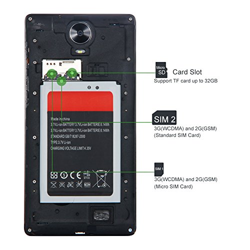 -. Feature : Fast 1.3 GHz quad-core MediaTek MTK6580A ARM Cortex Processor with 8 GB Internal memory and 1 GB RAM / Enjoy Google Android 5.1 Lollipop, including Google Play Store, WhatsApp, Gmail, Facebook and more / Dual SIM and MicroSD(TF card) support for up to 32 GB of expandable storage / 6.0" HD 720*1280 IPS display plus an amazing 8 MP main camera and 2 MP selfie camera, both cameras are with LED flash, Back camera with auto focus / 3G(WCDMA 850/2100 MHz) plus GSM(850/900/1800/1900 MHz) unlocked for your favorite compatible carrier or for international travel; For example, works both 2G and 3G for AT&T; only works with 2G networks for T-Mobile not 3G; Not works for CDMA Carriers like Verizon and SP.R.Int