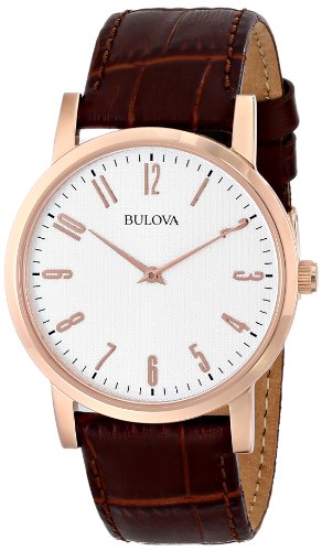 -. Binding : Watch -. Brand : Bulova -. Color : Rose Gold/Brown -. Department : mens -. EAN : 0042429489592 -. Feature : Due to a recent redesign by Bulova, recently manufactured Bulova watches, including all watches sold and shipped by Amazon, will not feature the Bulova tuning fork logo on the watch face. / Silver white dial / Leather strap / Flat mineral crystal / Water resistant to 99 feet (30 M): withstands rain and splashes of water, but not showering or submersion -. Label : Bulova -. Manufacturer : Bulova -. Model : 97A106 -. MPN : 97A106 -. PackageQuantity : 1 -. PartNumber : 97A106 -. ProductGroup : Watch -. ProductTypeName : WATCH -. Publisher : Bulova -. ReleaseDate : 2012-01-16 -. Studio : Bulova -. Title : Bulova Men's 97A106 Leather Strap Watch -. UPC : 042429489592