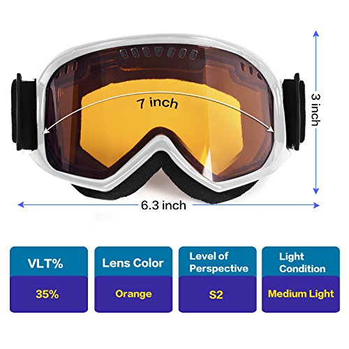 -. Feature : Anti-fog OTG ski goggles for men, women and youth: Designed to be worn over glasses. The inner lens has anti-fog coatings to protect against misting and fogging. Available in a variety of different styles and colors, perfect snow goggles for skiing, snowboarding, ATV, snowmobile and snocross. / Excellent Optical Clarity without Deformation and Smooth Venting - Designed for superior eyes protection and ultimate comfort, the large cylindrical lens features with mirrored appearance provides a real and clear view in snow. Full channel vents on top & bottom sides and 13 holes on lens enhance air-flow to reduce fogging in warm, moist condition. / Adjustable and Detachable Strap Helmet Compatibility - The extra long head strap fits different size of helmet and facemask very well, which offers universal integration and all-day comfort when you skiing and snowboarding. It is suitable for men, women & youth and perfects for skiing and snowboard / Comfortable Triple Layer Foam and Safety Durable TPU Frame - Double layer high density foam can cut winds out and keep your face warm. Made of TPU frame and PC lens, the ski goggles ensure the face and eyes can be well-protected when emergency occurred. / Lifetime Warranty and 100% Customer Satisfaction: Free product unlimited warranty is offered to our customers. If for any reasons you are not satisfied with our goggles, replacement or refund will be provided for your preference - no questions asked.