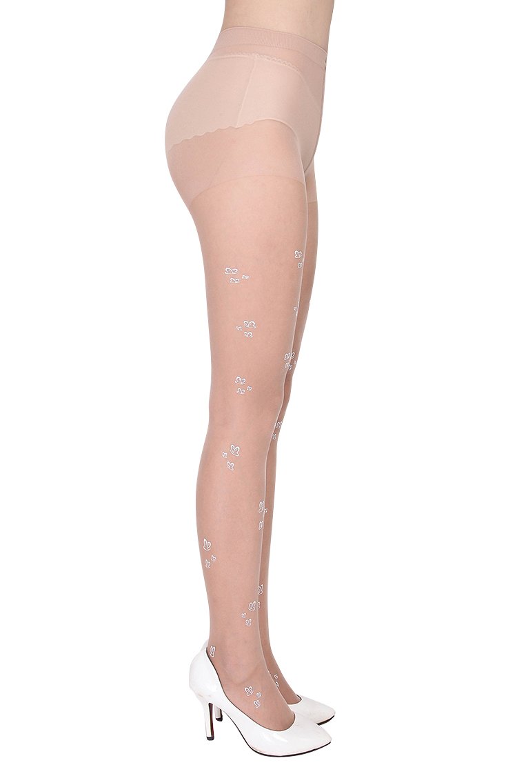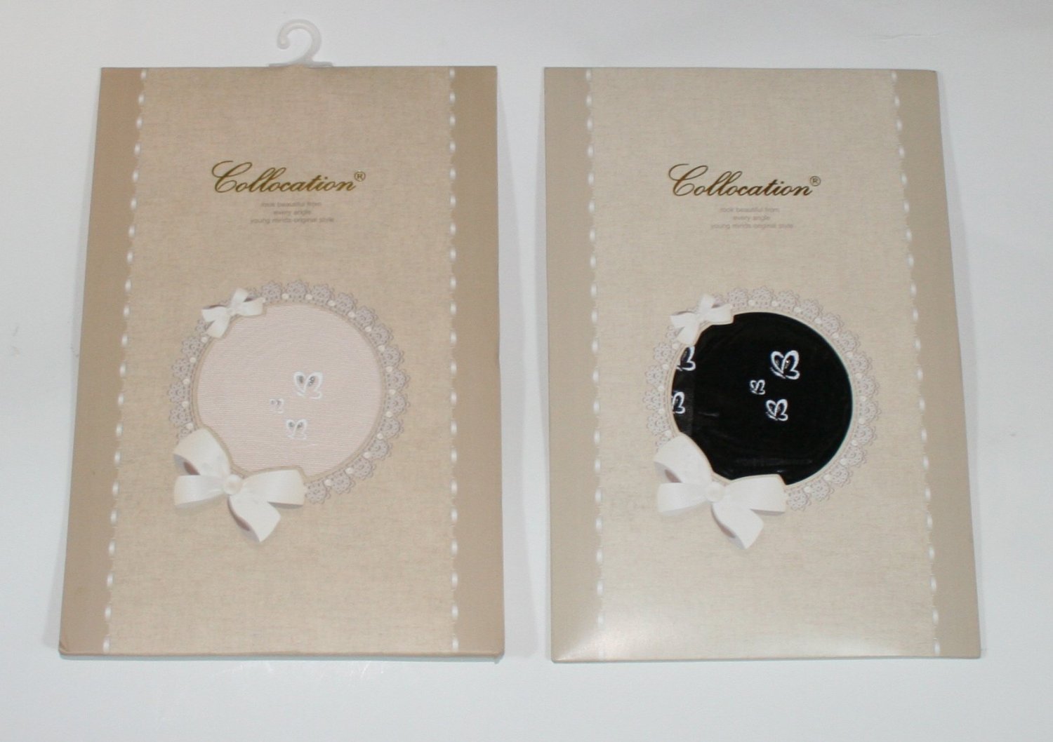 It is a cute butterfly pattern, two sets of beige and black tights.