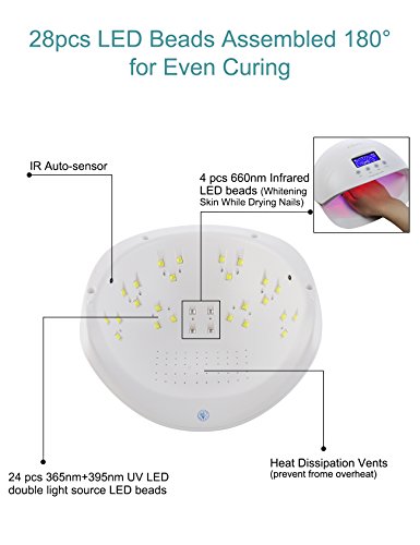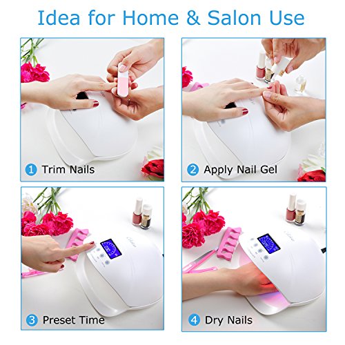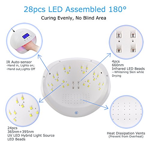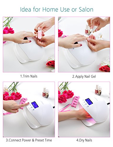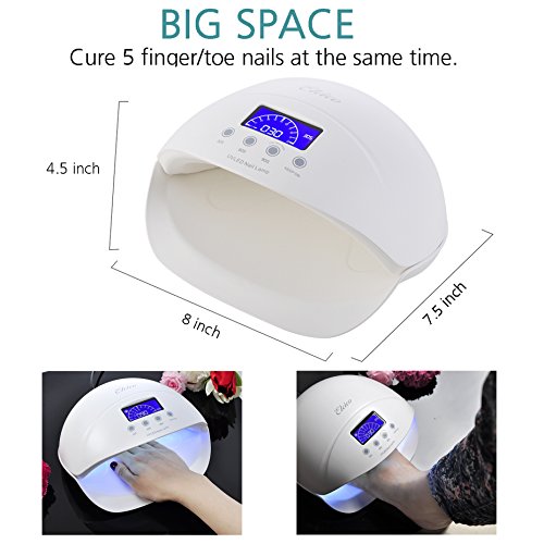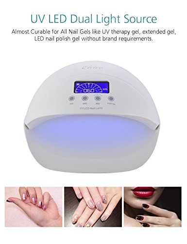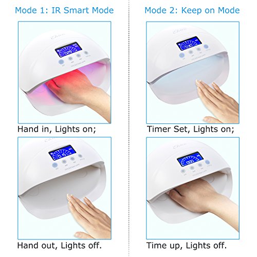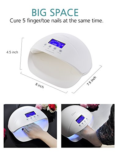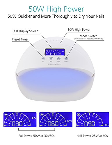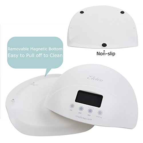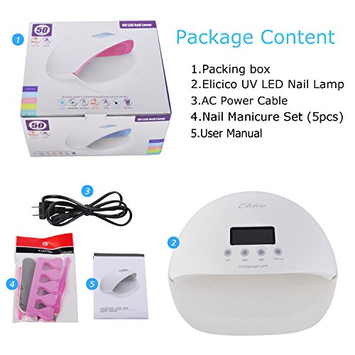 Elicico UV LED Nail Gel Lamp with 50W high wattage and dual UV LED light source is specially designed for rapid and efficient gel curing, particularly for the high-performance Gelish Soak-Off Gel Polishes, and you can expect a high-gloss finish that lasts up to three weeks without any chipping or peeling off. ? Features ?Dual UV LED Light- Can rapidly cures almost all UV gel and LED gel without brand requirements.?The LED light will not overheat to blacken skin and is no harm to eyes. Even can whiten your skin while drying your nails under IR Auto-sensor mode. ?Preset Timers-Can preset 30s/60s/90s according to the gel type. ?LED Display Screen-A large LED screen shows the time you have left and the wattage half or full. ?IR Auto-sensor-Hand/foot in, lights on; hand/foot out, lights off. ?Big Space-Large enough to fit all 5 fingers/toes at once ?Removable Bottom-Its magnetic bottom plate is easy to pull off to allow easy cleaning. ? How to Use? 1.?Supply power to the nail lamp. 2. Choose the mode and set the appropriate timer(30s/60s/90s) as per your gel polish's requirements.? 1) The default mode is IR-sensor mode. After timer set, the nail dryer would turn on or off automatically when you put hand/foot in or out. (Under this mode, IR LED skin whiten function works automatically.) 2) If you press "KEEP ON"?button to turn it to "KEEP ON"?mode, after timer set, the lights would keep on and automatically shut off after the specified time. ? Warm Tips ?Please do not move your hand too much until curing is completed for better performance.