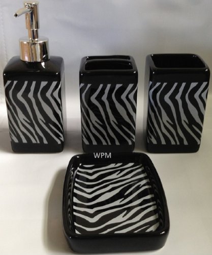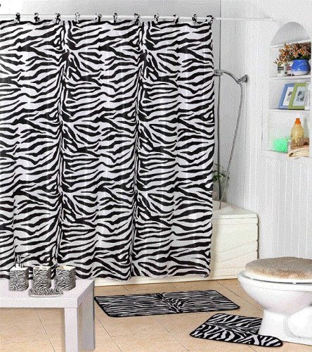 -. Feature : 17 Piece Bath Set- Black White Zebra / 4 pcs bath accessory set: 1 toothbrush holder, tubler, soap dish and lotion dispenser (Accessories are Black and OffWhite) / 1 Fabric Shower Curtain 70"x72" (180cmx180cm) with 12 matching decorative rings / Great Design: Black and White Zebra / Material: Ceramic, fabric shower curtain