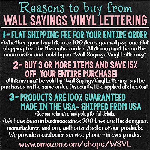 PLEASE READ: Before clicking "Add to Cart" be sure that it says "Sold by Wall Sayings Vinyl Lettering". Any other sellers listed on this item are doing so illegally because WALL SAYINGS VINYL LETTERING is the manufacturer and we do NOT sell to re-sellers. We cannot guarantee the quality of counterfeit decals.Counterfeit decals can have jagged edges and either do not stick at all or they take the paint off your wall upon removal. We are the manufacturer and the ONLY seller of our products.