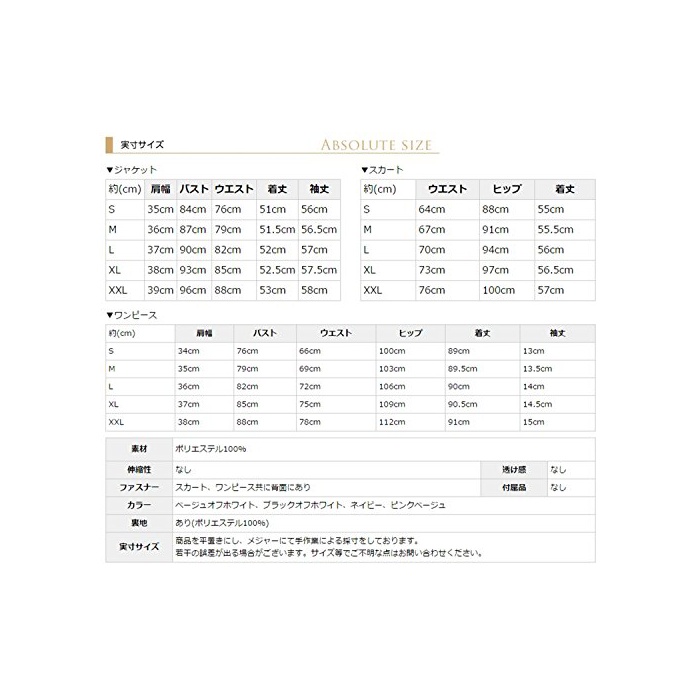 【사이즈】S/M/L/XL/3L 【신축성】없음 【패스너】원피스:배면 스커트:뒤 【부속품】없음