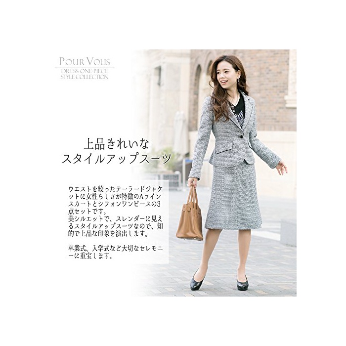 【상품 특징】웨스트를 짜낸 테일러드 쟈켓에 여성다움이 특징의 A라인 스커트와 시폰 원피스의 3점 세트입니다.