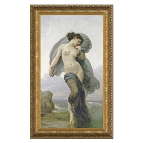 Sumptuously idealized form and sensuous depth of emotion characterize this classical work by Bouguereau. Our authentic stretched canvas replica captures the original painting's texture, depth of color, and even its subtle brushstrokes, which are applied by hand. Our replica European style, bright gold-toned, ribbed frame is cast in quality designer resin with an acanthus leaf and floret border that draws the eye toward this beautiful image. Medium: 19"Wx32"H.Feature