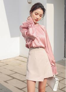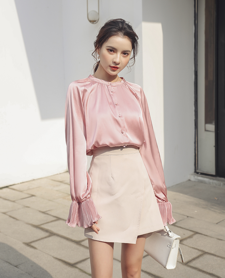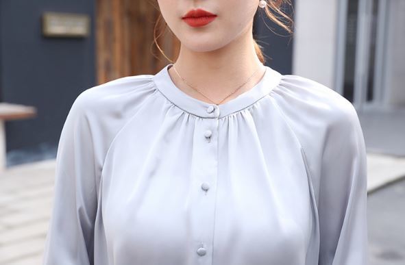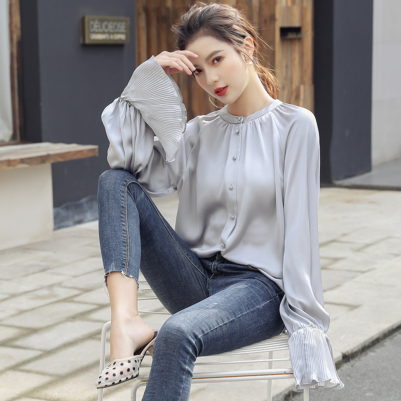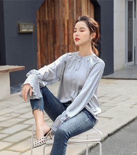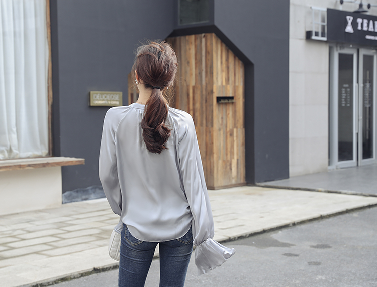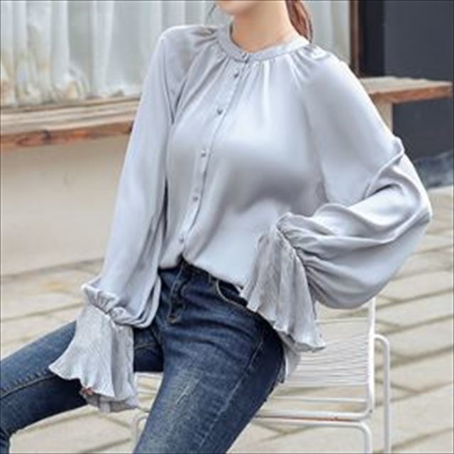 光沢のあるとろんとした生地感がエレガントな長袖ブラウスのご紹介です。