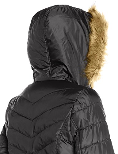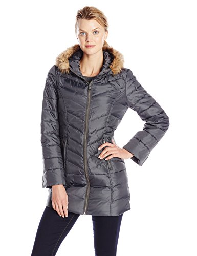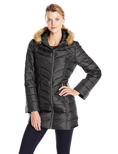 Quilted zip-front coat featuring zippered pockets and faux fur-trimmed hood