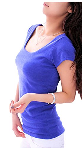-. Title : (レアノリ)Leonori 魅せる カットソー レディース 胸元 セクシー デザイン 半袖 谷間 開き インナー 無地 Tシャツ 薄手 シンプル スリム トップス(F, 青)