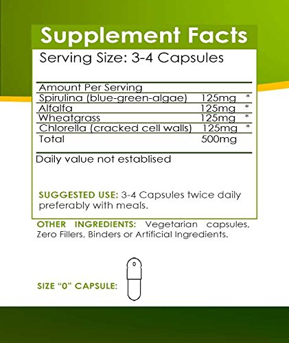 Product DescriptionPURE ORGANIC SPIRULINA ALFALFA WHEATGRASS CHLORELLA CAPSULES (500mg)0
