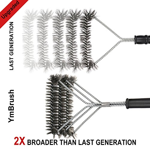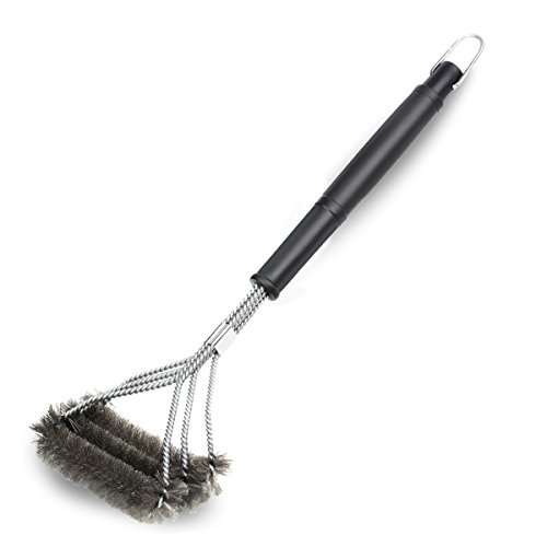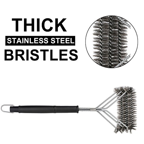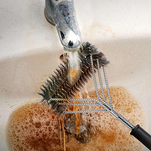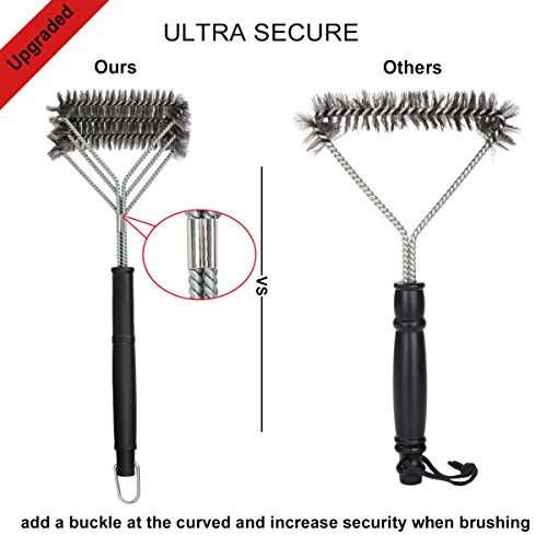NEW AMAZING DESIGN - After Reviewing customers’ comments, we develop a new design of grill brush. We convert this 3 in 1 barbecue grill brush from vertical to horizontal direction so that the surface of brush will touch maximum area of grill grates and become more effective. We also add a buckle at the curved that customers are easy and secure to brush when having force on the brush.