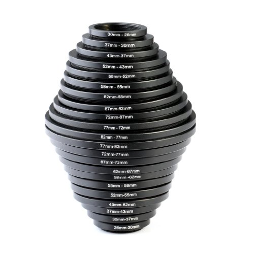 Kit Includes: K&F Concept 22pcs 26-30MM,30-37MM,37-43MM,43-52MM,52-55MM,55-58MM,58-62MM,62-67MM,67-72MM,72-77MM,77-82MM,30-26MM,37-30MM,43-37MM,52-43MM,55-52MM,58-55MM,62-58MM,67-62MM,72-67MM,77-72MM,82-77MM Step Down Step Up Ring