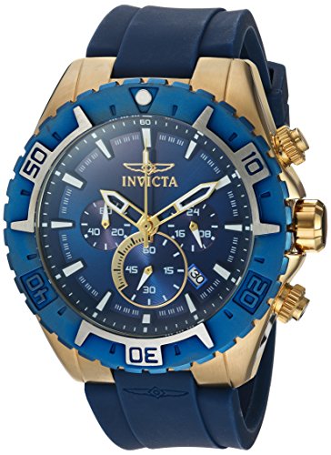 Take your look to new heights with this dynamic Aviator timepiece from the ever-innovative Invicta! The wide, 49 millimeter case is striking in 18K gold plated stainless steel with a unidirectional blue steel bezel and houses a blue dial with clean indices and luminous detailing for easy viewing. The wide, silicone strap is complementary in a vibrant blue hue for a bold accessory that will be sure to complete any outfit, no matter the occasion. This website is an authorized reseller of Invicta and each piece comes with the manufacturer warranty.Feature