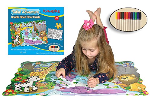 -. Feature : ► GREAT CRAFT FOR LITTLE KIDS. Because Kidwerkz' double-sided puzzle has extra-large, easy to handle pieces with no sharp edges, it is quite safe for toddlers. Your child will have a blast putting together, coloring, and playing with this fun, arts and crafts puzzle. And don't worry Mom-the markers are washable (because we all know what would happen if we handed a toddler a permanent marker). Pickup is hassle-free as well because this colorful floor puzzle is jumbo-sized. / ► GREAT GIFT IDEA. Need a gift idea? This 3 in 1 floor puzzle is perfect for any occasion. Birthdays, christmas, game nights, you name it! The lovely artwork is a wonderful reward for finishing this safari adventure puzzle and will be a favorite go-to activity. Give your little artist a chance for their skills to flourish and buy one now! / ► OFFICIAL KIDWERKZ PROJECT. Kidwerkz is a USA based company, and all customer service is handled in the USA. We offer a 1 year manufacture warranty on new items. / ► 3 IN 1 FUN! Kidwerkz' double-sided puzzle incites fun for the whole family! Elephants, monkeys, and more live happily together in this wonderful, jumbo floor puzzle, offering a perfect recreation for your little puzzle-lover. This fun arts and crafts puzzle offers three activities: you can put it together, color it, and play seek-and-find! One side is blank, allowing them to use their imagination and color it their own way. The other side we colored for you with original art by Lisa Workman. / ► INCREASES AND STRENGTHENS IMPORTANT SKILLS. With hippos swimming in the river and colorful birds watching from above, this adventure puzzle is a great past-time for creativity-building and problem solving. Your child will be challenged to put together their 50 piece puzzle and will enjoy using their imagination to color the blank side of the puzzle. By handling around the puzzle's thick, jumbo sized-pieces, your child's skills in hand-eye coordination and motor skills will be improved as well!