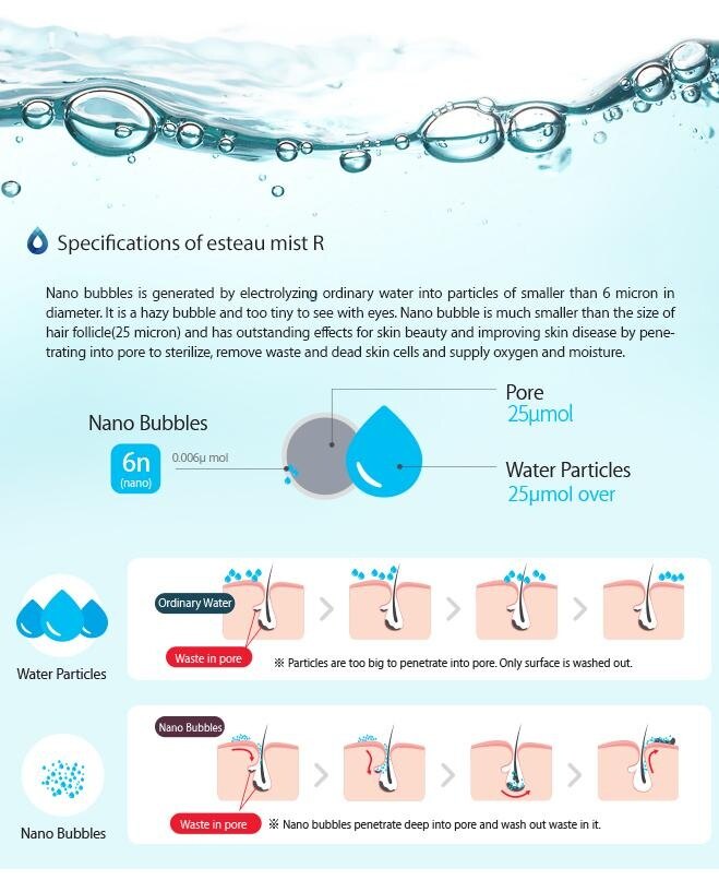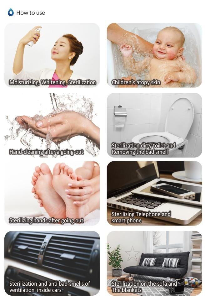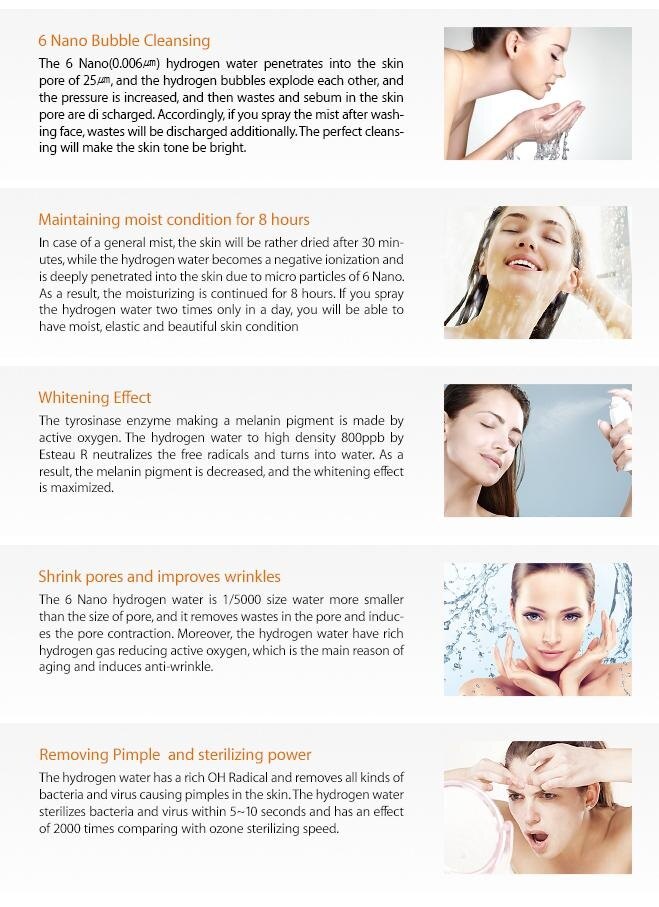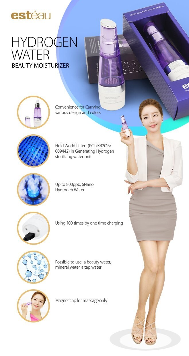 **Hydrogen Water Beauty Moisturizer R **World first, Hydrogen Water Nano Bubble Moisturizer **Made in Korea, Genuine product **Latest Nano tech! ORP range from 250 ~ -400mV **Sterilizing in addition to skin moisturizing! 99.9% sterilizing power **Process of washing pore using micro-bubbles **Esteau R, your skin health keeper **Micro bubble is very effective for skin moisturizing and improving skin disease **Habituate it for oral health! Spray and gargle! **Sterilization of 99.9% S. mutans, the cavity- **Hate to go to public toilet because of dirty toilet bowl? Sterilize about 650 different toilet germs with simple spray