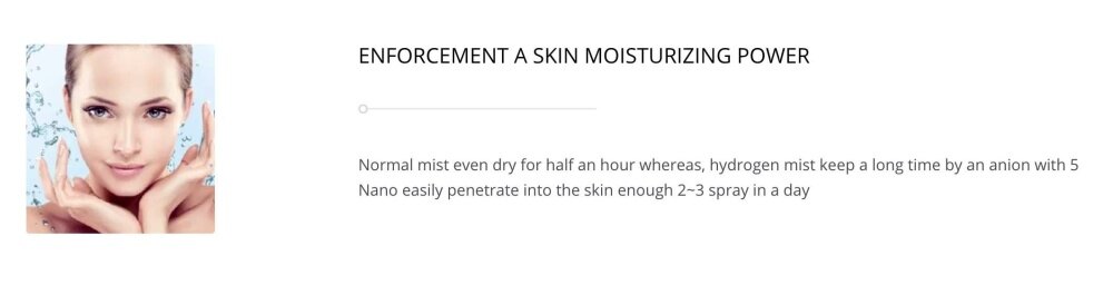 ---ENFORCEMENT A SKIN MOISTURIZING POWER Normal mist even dry for half an hour whereas, hydrogen mist keep a long time by an anion with 5 Nano easily penetrate into the skin enough 2~3 spray in a day