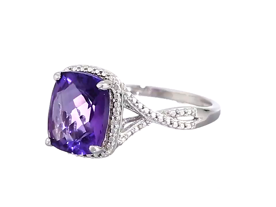 Sterling silver ring featuring cushion-cut rectangular amethyst in beaded border with two small diamond accents