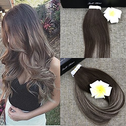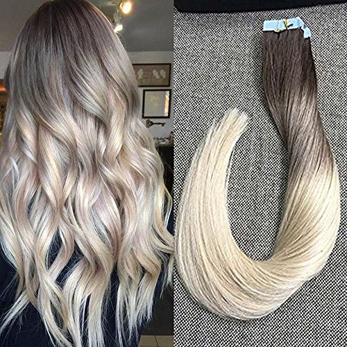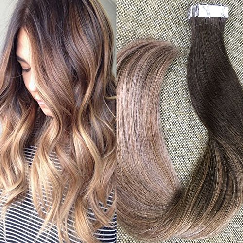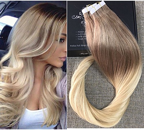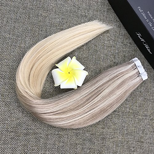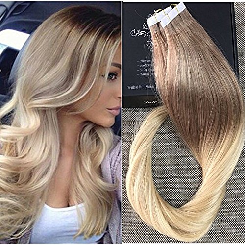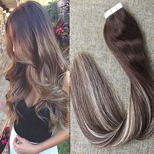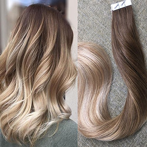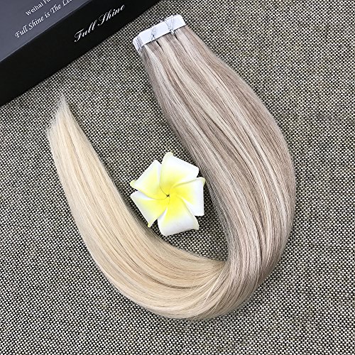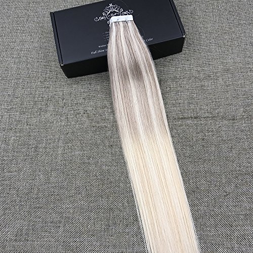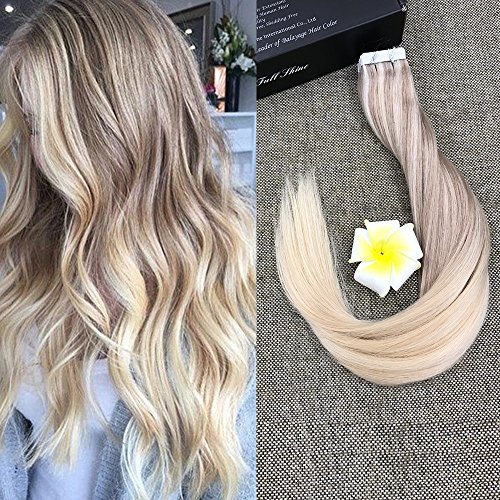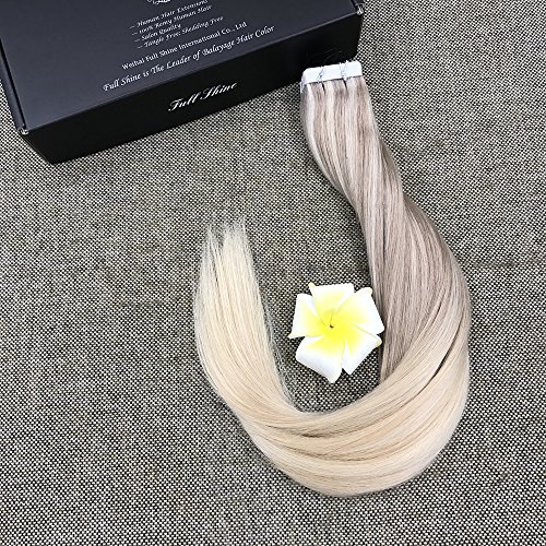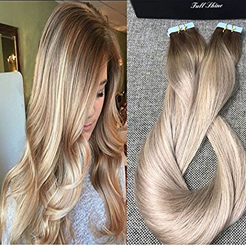 Product name: Seamless Tape in Hair; Length: 18"; Color:#18 Fading to #22 and #60 Balayage; Weight: 2.5g Per Piece; 50g Per Package; Quantity: 20 pcs Per Pack, Usually, 40 pcs Make a Full Head.20 Pcs For Highlight; Quality: Tangle Free, Shedding Free, Silky Feeling, Soft Hair; Tape Hair Can Add Instant Length and Volume. You Can Apply it Yourself. Hair Can be Styled, Cut, Colored, Highlighted, Treated Just Like Your Own Hair.
