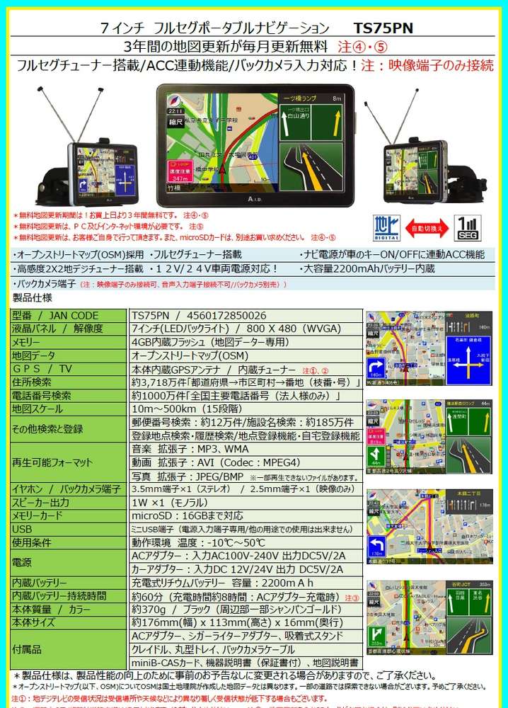 ●付属品 ACアダプタ、シガーライターアダプタ、吸着式スタンド