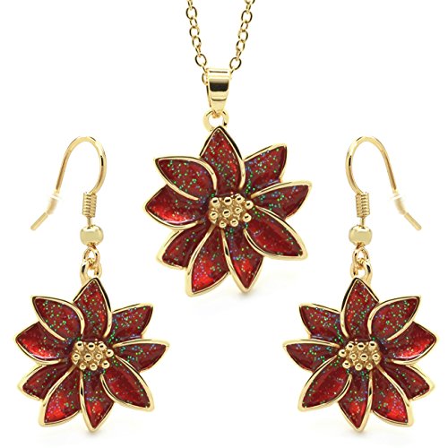 -. Binding : Jewelry -. Brand : Sparkly Bride -. Department : womens -. Feature : Fashion jewelry set consists of pendant necklace and matching earrings set. Featuring Christmas Poinsettia Flower design. Perfect choice to celebrate the holidays / Made of base metal alloy / Accented with red enamel / Pendant comes with cable chain 16 inches adjustable to 18" inches. Earrings are with fish hook clasp. For pierced ears. / Item comes in a giftbox ready for gift giving -. Label : Sparkly Bride -. Manufacturer : Sparkly Bride -. Model : YZ-SET18215 -. MPN : YZ-SET18215 -. PartNumber : YZ-SET18215 -. ProductGroup : Jewelry -. ProductTypeName : FASHIONOTHER -. Publisher : Sparkly Bride -. Studio : Sparkly Bride -. Title : Red Poinsettia Jewelry Set Christmas Pendant Necklace Matching Earrings Gold Plated, 16+2" extender