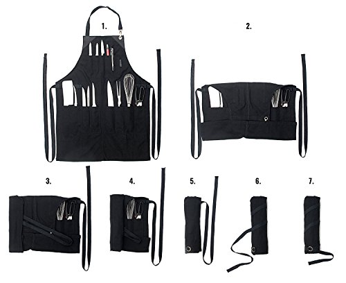 - KNIFE ROLL APRON WITH SAFE FASTENING DESIGN – This apron is made of durable heavy-duty, yet soft 14 oz cotton canvas, and it is perfect for you who treasures your tools: after taking your apron off, you can roll it, using our strap-ring system to fasten and protect what you need.