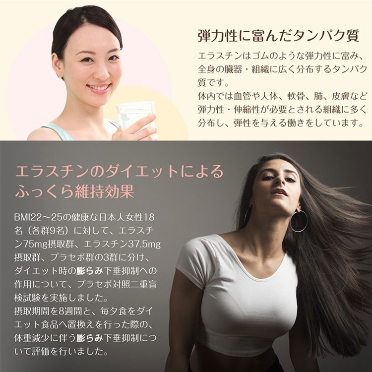 ・海洋性「コラーゲンペプチド」、イソフラボンが豊富な話題の新素材「プエラリアミリフィカ末」に、カツオ由来の「エラスチンペプチド」を加えた新しい本格サプリです。