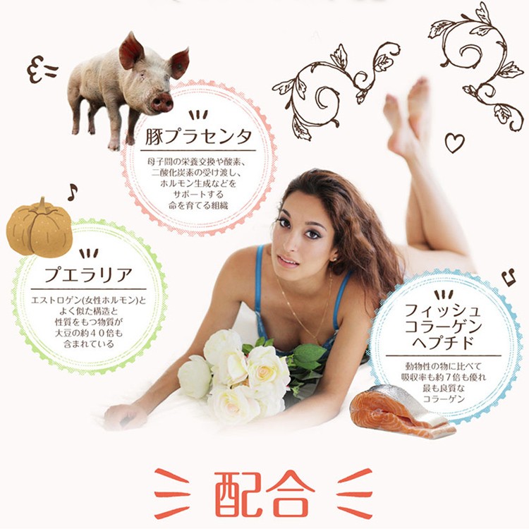 | 原材料名 | フィッシュコラーゲンペプチド プエラリア・ミリフィカ末 還元麦芽糖水飴 エラスチンペプチド 鉄含有酵母 デキストリン 発酵熟成プラセンタエキス末 (プラセンタエキス 黒糖 酒酵母) セルロース ステアリン酸Ca 二酸化ケイ素 ヒアルロン酸 葉酸 |
