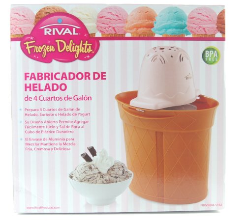 Rival's Frozen Delights 4 quart machine makes ice cream, frozen yogurt and sorbet. The open design allows for easily adding rock salt and ice to the durable plastic bucket. The aluminum mixing canister keeps concoctions cold, creamy and delicious.