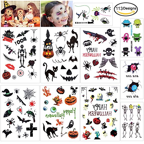 - Includes 10 sheets temporary tattoos bulk 113 designs more special style to share with kids,haunted,bag,favors,trick or treat,creepy,monster,pumpkin,ghost,ghoul,spooky,bat,frankenstein,witch