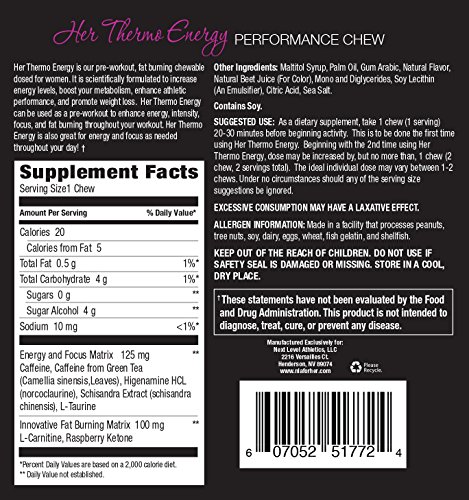 -. Binding : Health and Beauty -. Brand : NLA for Her -. EAN : 0607052517724 -. Feature : Concentrated thermogenic fat burner / Increased energy and focus / Energy and Focus Matrix to boost energy and focus / Innovative Fat Burning Matrix to jumpstart your metabolism and promote fat burning / All NLA for Her supplements are created in GMP and NSF certified manufacturing facilities -. IsAdultProduct : 0 -. Label : NLA for Her -. LegalDisclaimer : * These statements have not been evaluated by the Food and Drug Administration. This product is not intended to diagnose, treat, cure, or prevent any disease. -. Manufacturer : NLA for Her -. MPN : 13234 -. NumberOfItems : 1 -. PackageQuantity : 1 -. PartNumber : 13234 -. ProductGroup : Health and Beauty -. ProductTypeName : HEALTH_PERSONAL_CARE -. Publisher : NLA for Her -. Size : 30 count -. Studio : NLA for Her -. Title : NLA for Her - Her Thermo Energy Performance Chew - Pre-Workout Energy + Fat Burning - Tropical Fruit - 30 Soft Chews -. UPC : 642141954905