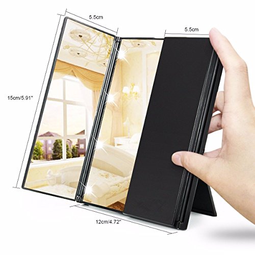 Studio : Cohome Publisher : Cohome Binding : Misc. Product Description Product Description A charming and fashionable gift for Mothers/ Friends/ Lovers Suitable Audience: 1. Beauty enthusiasts, especially those who love to focus on their appearance will like this mirror most. 2. For people who often need to Make-up, this light mirror is easy to carry and convenient to use. 3. For people who work at night, this mirror can be used in dark places when they apply makeup. The usage of the light mirror 1. First open the mirror and open the top right switch. 2. LED lights on so you can comfortably use the mirror. 3. Use the switch to turn off and close the mirror. Features: The LED lighted adjustable tabletop makeup mirror is a portable bathroom and makeup accessory that uses LED light provide a clean, bright reflection whenever you need it The mirror features long lasting LED bulbs that are lined arround the mirror to distribute light evenly. The LED bulbs will last the life of your mirror and cool to the touch for your safety LEDs have a lower power requirement for providing continuous brightness and light, require 2 CR2032 batteries (included) to operate. The brightness of the led lights can not be adjusted The ON/OFF switch located on the top of the device will activate the power when you need it. This LED lighted makeup mirror fits easily on the table top and includes an adjustable up and down tilt? Frame material: ABS Color:Black Size:154*121*8mm Package Includes: 1 x Tri-Fold LED Makeup Mirror(with battery) 1x Instruction 0