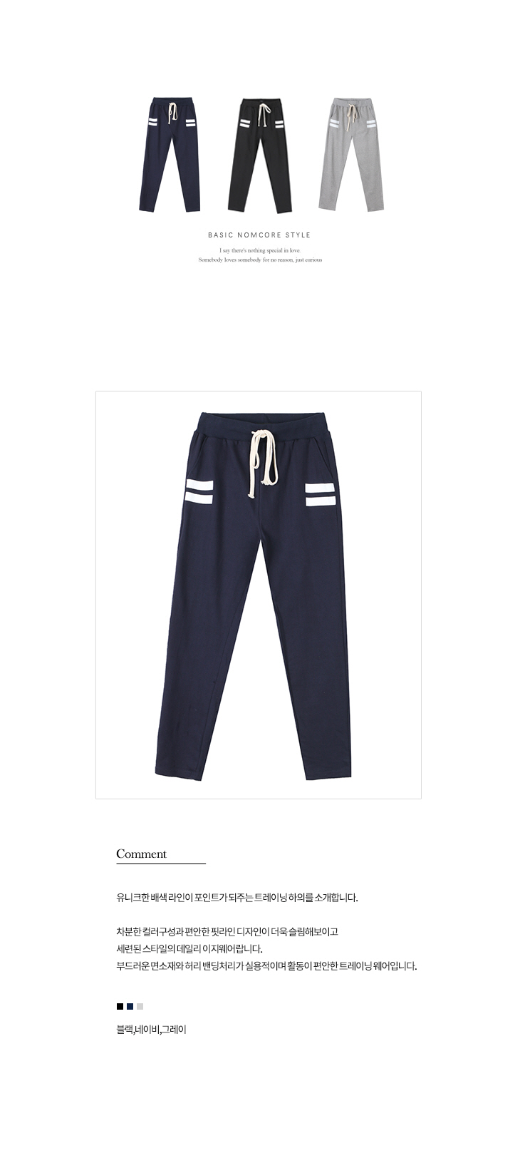 ▣상품설명 : 유니크한 배색 라인이 포인트가 되주는 트레이닝 하의를 소개합니다.차분한 컬러구성과 편안한 핏라인 디자인이 더욱 슬림해보이고 세련된 스타일의 데일리 이지웨어랍니다.부드러운 면소재와 허리 밴딩처리가 실용적이며 활동이 편안한 트레이닝 웨어입니다.