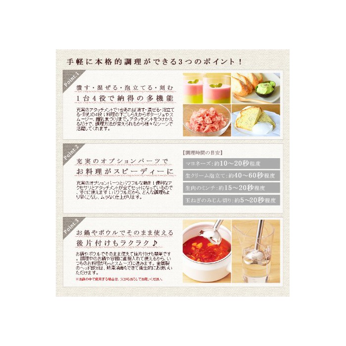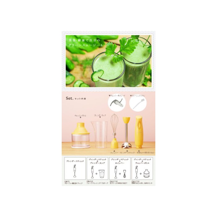 【세트 내용】본체×1/《부렌다스팃쿠》×1/《호잇파》×1/《부렌다캇푸》×1/쵸파(chopper) 보틀×1/쵸파(chopper)용 블레이드×1/클리닝 브러시×1/전용 레시피(요리처리법) 리플렛(6품목)×1 【보증기간】수매 보다 1년간