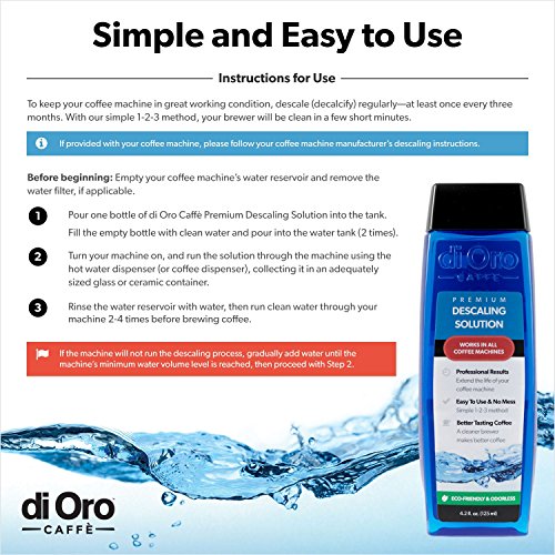 Keep your machine clean and running smoothly with di Oro Caffè Premium Descaling Solution: • :Safe for ALL brands of coffee or espresso machines • :No residue, no odor, no aftertaste • :Extends the life span of the machine • :Cleans 99.99% of bacteria • :Environmentally safe; 100% recyclable PET bottles