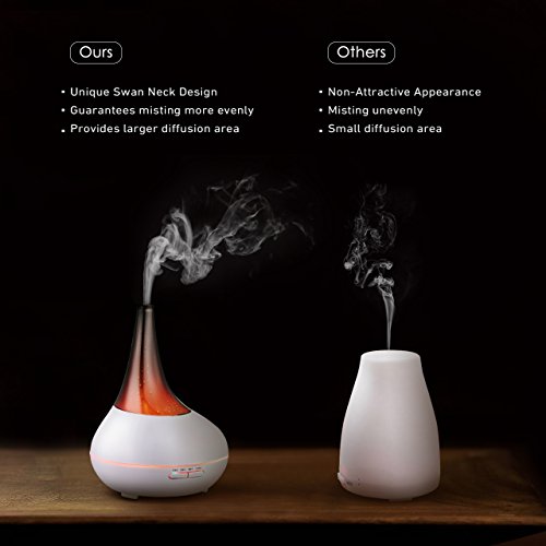 UNIQUE SWAN NECK DESIGN: Designed with special swan neck shape, which leads to larger diffusion areaThis essential oil diffuser quickly fills your room with an aromatic mist without heating or burning; thus preserving the therapeutic properties of the oils