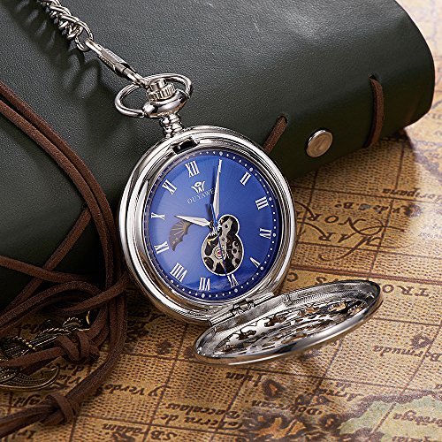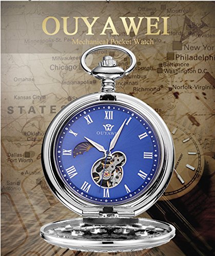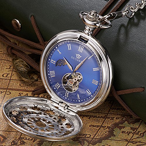 -. Feature : Special Design - Moon Face Design, blue hollow Dial.The Best Gift to Express Your Love. Unique skeleton dial with Roman Numerals carving Mechanical Pocket Watch design. blue hollow dial, looks very Elegant, Smart, Vintage and fashionable! / Hight Quality Watch-100% brand new with excellent workmanship, Precise mechanical movement, Elegant case with long chain, Good touch feeling. fit for casual environment and business occasion. / Battery Needless - No need to use battery, Twisting the top button on the spin, Swing the watch 15-20 times , Please wind up the watch before every usage and keep away from magnet to avoid making it stop working. / Fashion Accessory Watch - Attractive vintage design with unique dial, Add undeniable style and class to your daily life and fashion, An "Say You Say Me" at the suit, vest, pants or dress for gentlemen or ladies! / Best Choose- Comes with good quality gift box. Perfect gift for your love and family or yourself, Best Father's Day, Mother's Day Gift, Superb Christmas Gift, Birthday Gift, Wedding Gift etc.