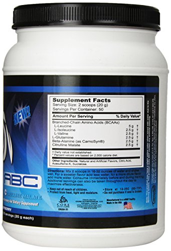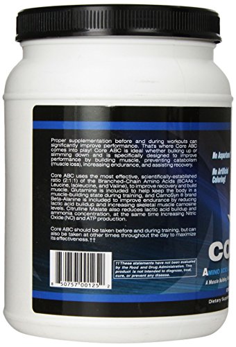 -. Feature : Core ABC was specifically designed to build muscle, prevent catabolism (muscle loss), increase endurance, and enhance recovery when taken before and during your exercise program / 10 grams BCAA, 2.5 grams Citrulline Malate and 2.5 grams Carnosyn Beta Alanine / The ingredients in Core ABC are ideal for maximizing exercise performance and aiding in recovery