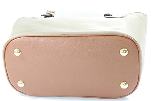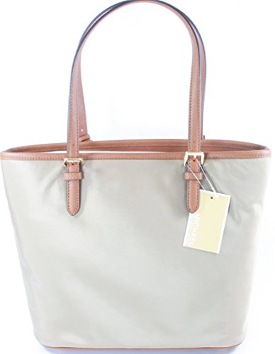 Wrapped in Michael Kors khaki / green nylon fabric and trimmed in luggage brown leather and polished golden hardware. Michael Kors color code is 'Dusk'. The interior is lined in Kors monogram print fabric and features a center zippered wall pocket, with an open top compartment on each side. The open compartments feature an inner zippered pocket and four open slip pockets. It has a luggage brown saffiano finished leather flat bottom panel with four metal feet. The front offers a snap flap top pocket containing 3 card slots and is accented with Michael Kors removable hanging logo charm. Adjustable dual brown leather straps have a comfortable drop of 7.5 inches. The overall measurements are approximately 10 inches (L) at the bottom tapering to 12 inches (L) at the top x 9.5 inches (H) x 5 inches (W).Feature