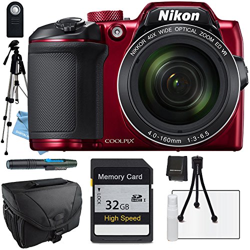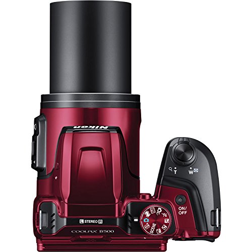 The Red COOLPIX B500 Digital Camera from Nikon features a 16MP 1/2.3" BSI CMOS sensor for high-resolution imagery as well as Full HD 1080p video. This sensor's construction utilizes a stacked backside-illuminated design to improve clarity and image quality when working in dimly-lit conditions. The 40x optical zoom lens provides a 35mm equivalent focal range of 22.5-900mm, covering wide-angle to telephoto perspectives to suit working in a wide variety of environments. Further subject magnification can be achieved using the 80x Dynamic Fine Zoom that effectively doubles the camera's reach. The lens also features Vibration Reduction to help reduce the appearance of camera shake when shooting at the longer zoom lengths or with longer shutter speeds. A 3" 921k-dot tilting LCD screen allows image composition from unique angles, as well as image review and menu navigation. Built-in Bluetooth low energy (BLE), Wi-Fi, and NFC connectivity allow the B500 to pair with a compatible smart device using the Nikon SnapBridge app. Images can then be easily sent to the connected smartphone or tablet, and from there shared on favorite social media sites. Designed for simple, stress-free operation with point and shoot capability for both still imagery and video, convenience is maximized by selecting from among 18 scene modes or using the Easy Auto Mode, which automatically optimizes the camera's settings even while shooting under challenging lighting conditions.Feature