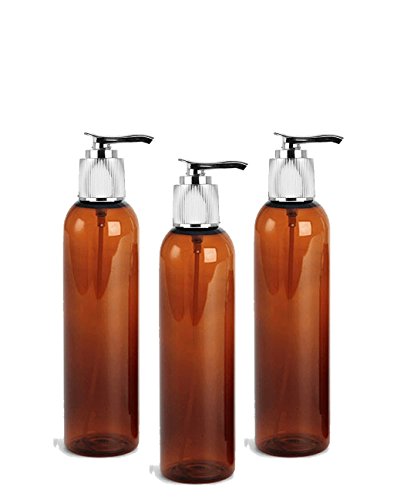 3 Elegant Grand Parfums Amber 8 Oz PET Cosmo Bottles with Shiny Silver Lotion Pump Cap Atomizer